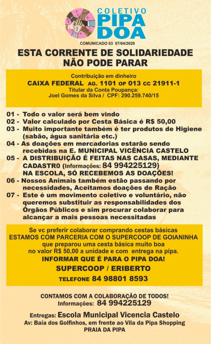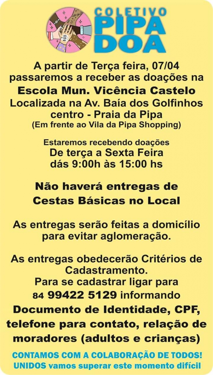 * To register call: 84 998115943 informing: Identity Document, CPF, contact telephone number, list of residents (adults and children).